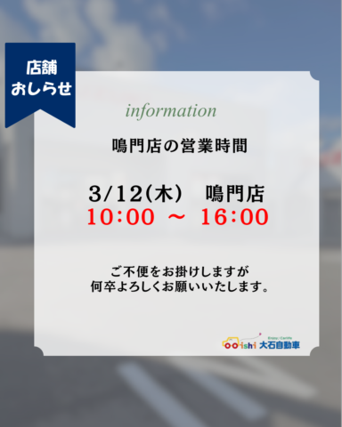 10/31【鳴門店】本日の営業時間 14時まで